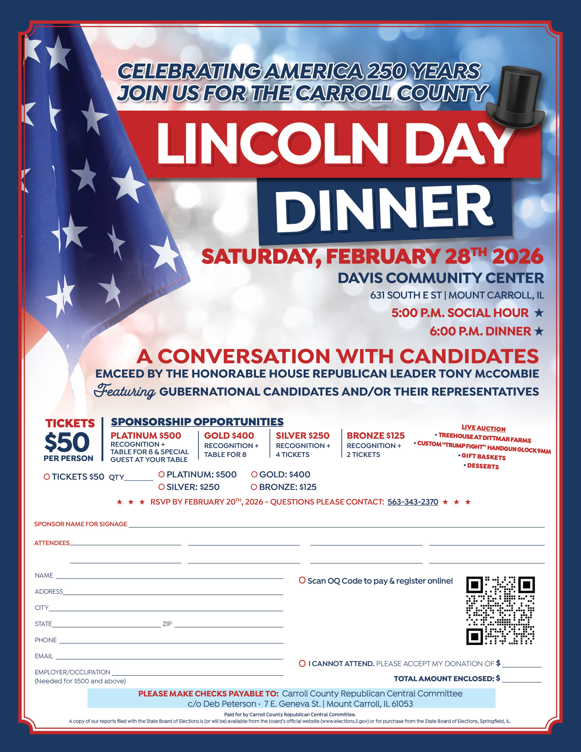 Join us for the Annual Carroll County Lincoln Day Dinner Friday, February 28th Social Hour: 5:00PM | Dinner: 6PM Davis Community Center 631 South E St, Mount Carroll, IL Featuring: A Conversation with Candidates Emceed by the Honorable House Republican Leader Tony McCombie Tickets: Individual: $50 Sponsorships: $500 | $400 | $250 | $125 RSVP […]
